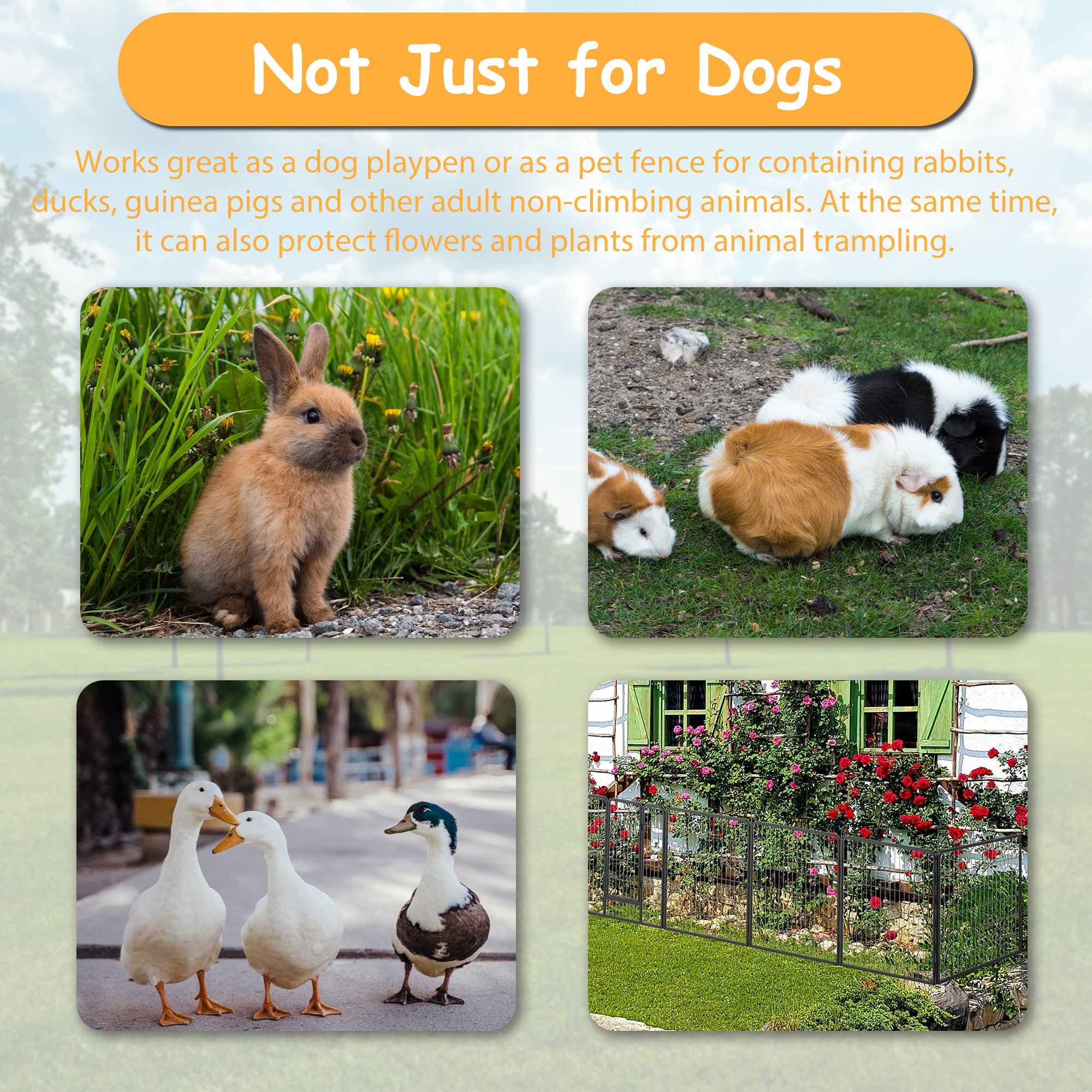3.[Versatile to Use] It can be used as a kennel, crate, pet hangout and playroom. It's taller 40" height makes it an excellent exercise area for small, medium and large animals including dogs, ducks, rabbits, hedgehogs, hamsters, turtles, guinea pigs etc. They can all have fun in this fence.