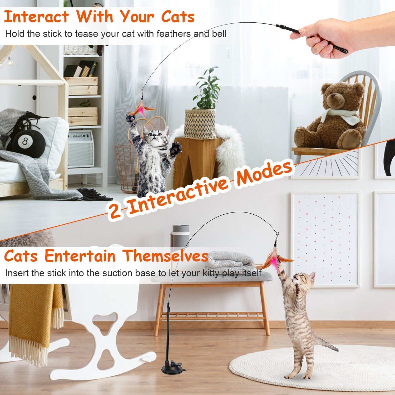 * 2 Interactive Modes*: Come with 2 feather wands; you can hold the stick to tease your cat with feathers and bell; or insert it into the suction base to let your kitty play itself!