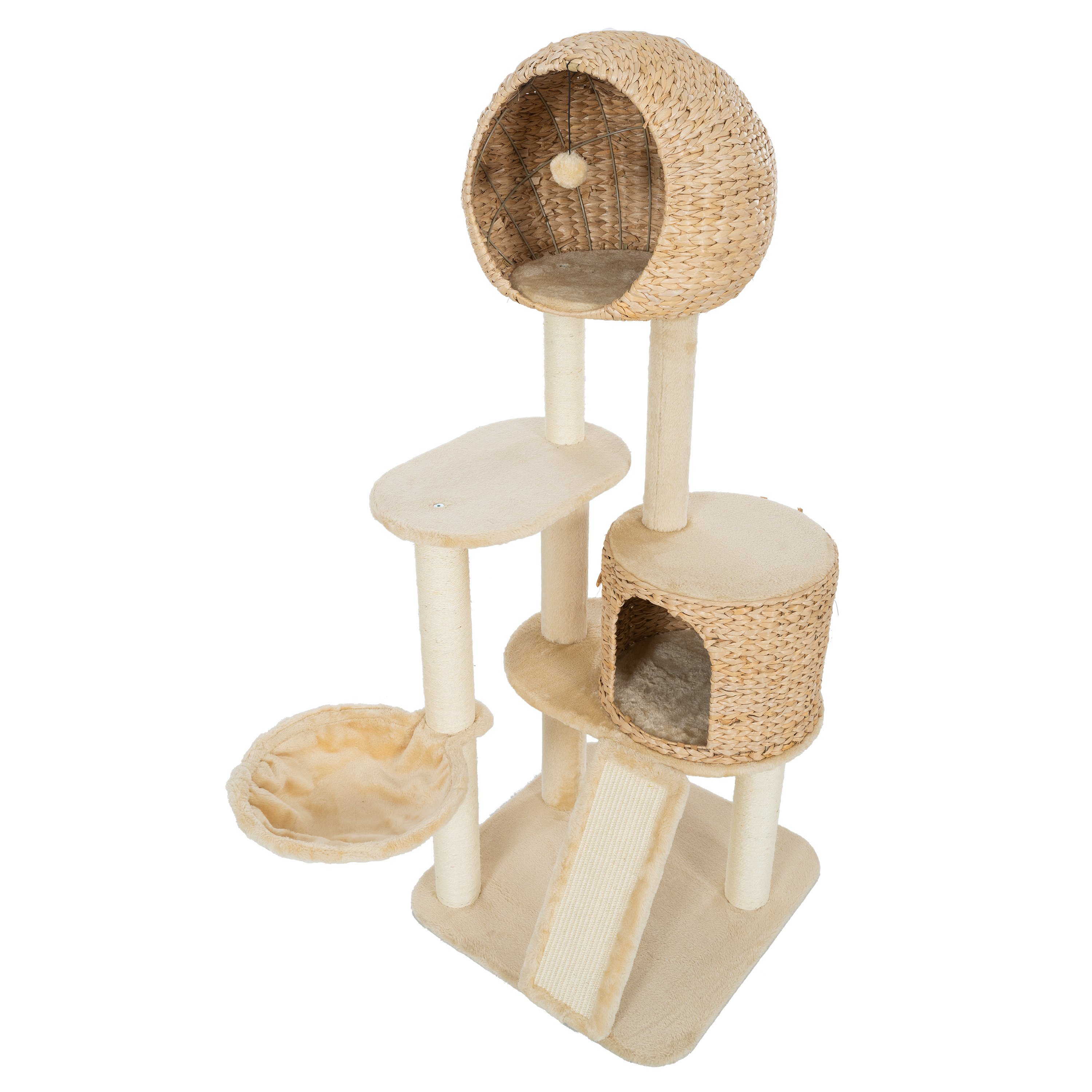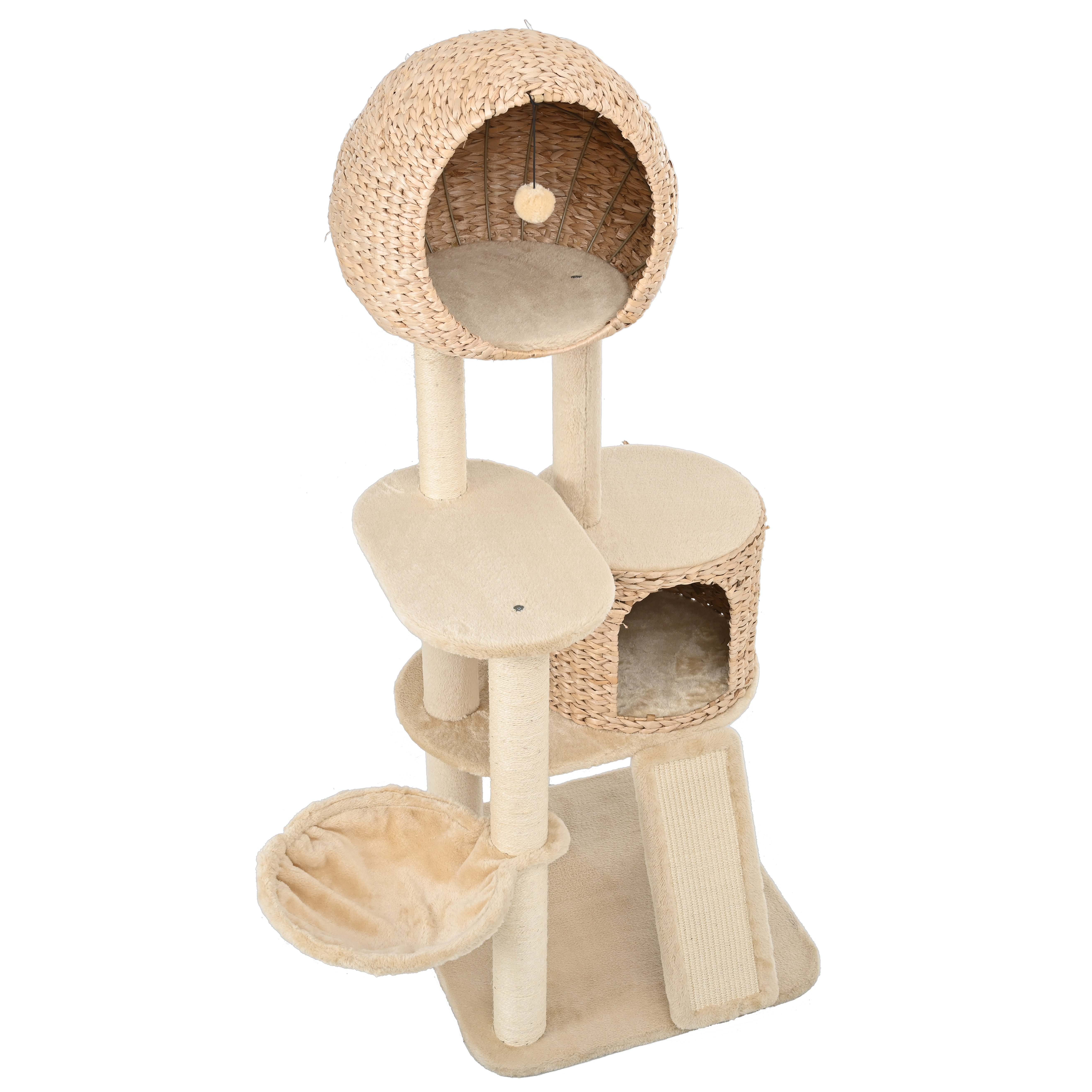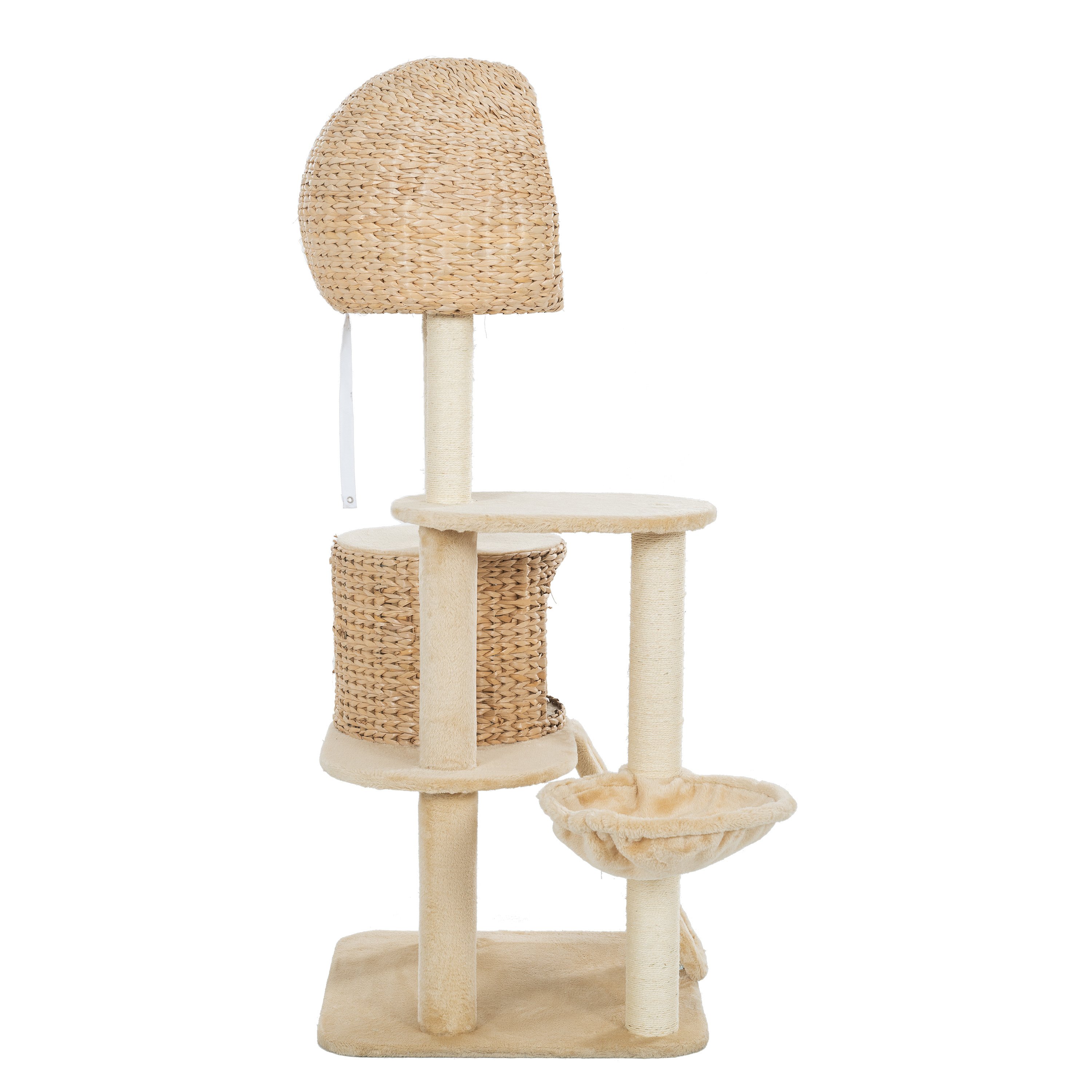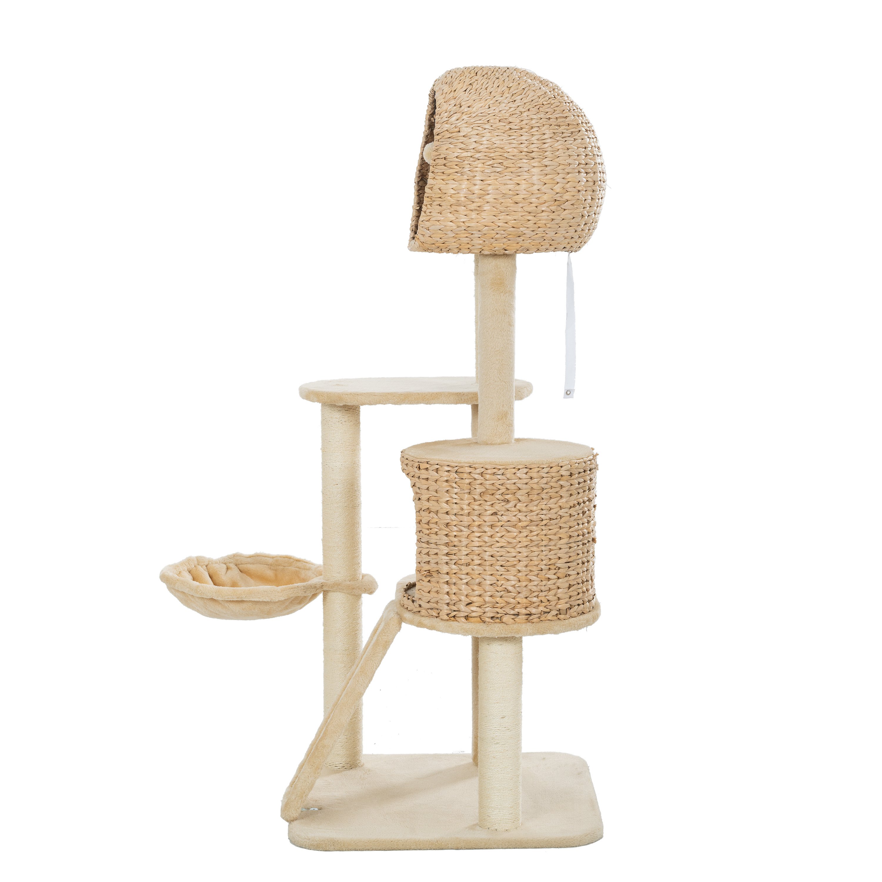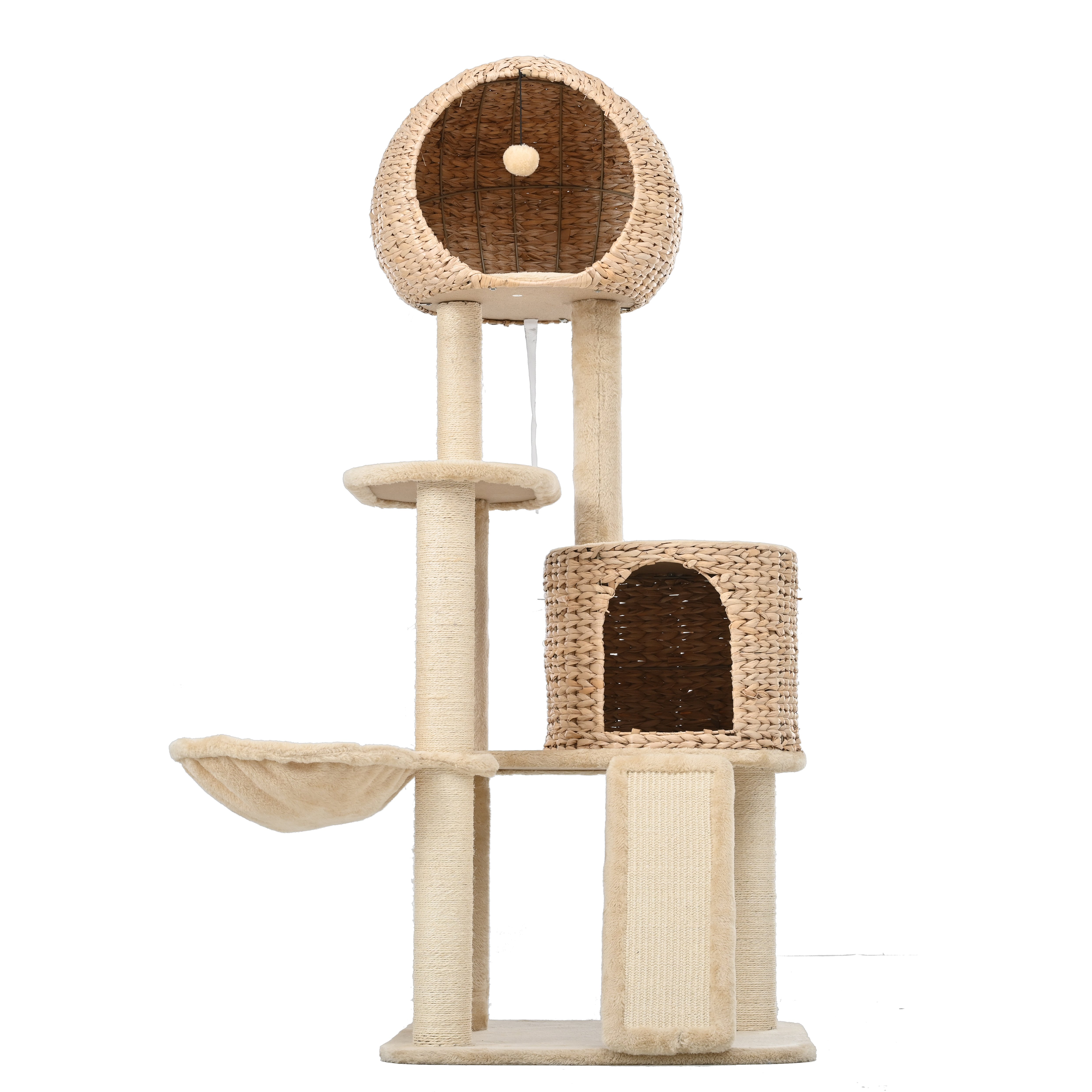 Specifications:Overall Size: 59inch X 23.6inch x 23.6inch, fit your multiple felines up to 80lbsTotal Height: 59inchNests: 2 hand-woven nests and 1 hammockPerches: 1 base perch and 2 plat perchesTeasing Toy: inner the top nest