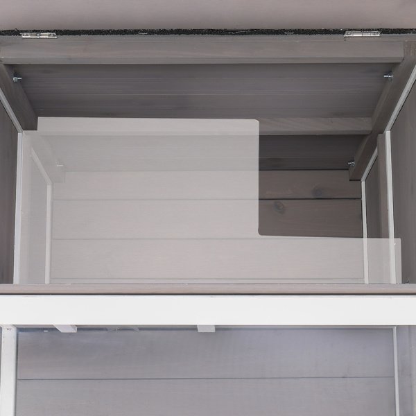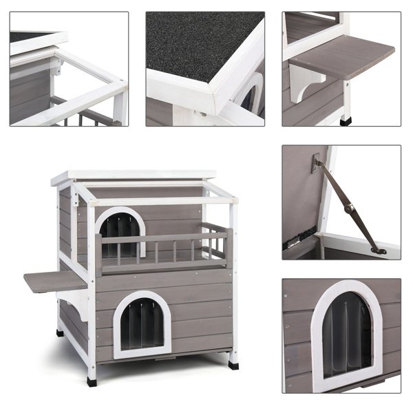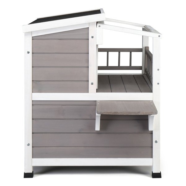 This wooden pet home with balcony with Transparent Canopy provides small pets with a secure and relaxed environment that can be used both indoors and out. Constructed using weather-treated non-toxic fir wood means and waterproof asphalt roof; this adorable home will endure years of use with very little maintenance. Its functional design allows pets to lounge comfortably on the balcony; or retreat inside the spacious condo sleep and play for the perfect get-away. The elevated foundation; with removable floor; promotes air circulation and protects your pet from ground chill and wet conditions. This stylish cat shelter is suitable for your backyard; patio; living room and other places.