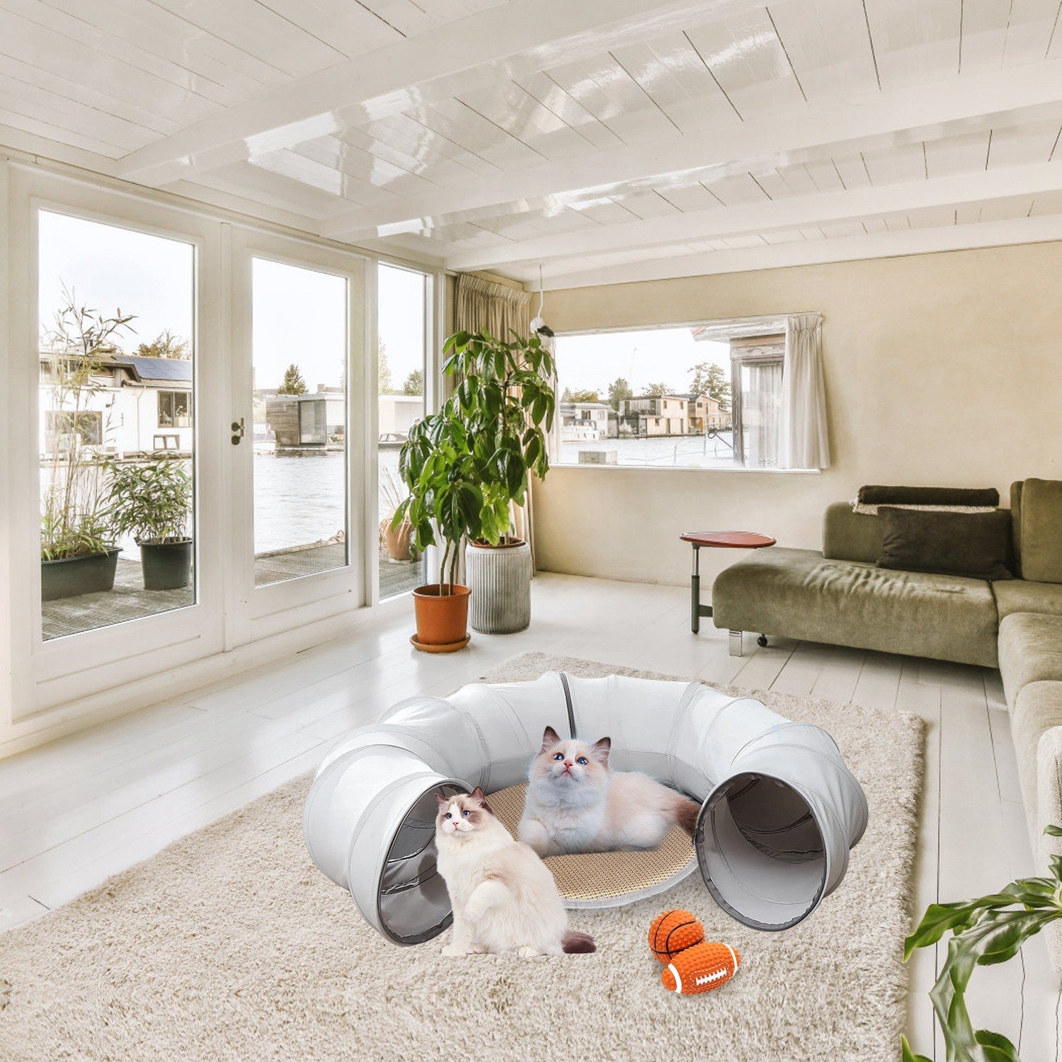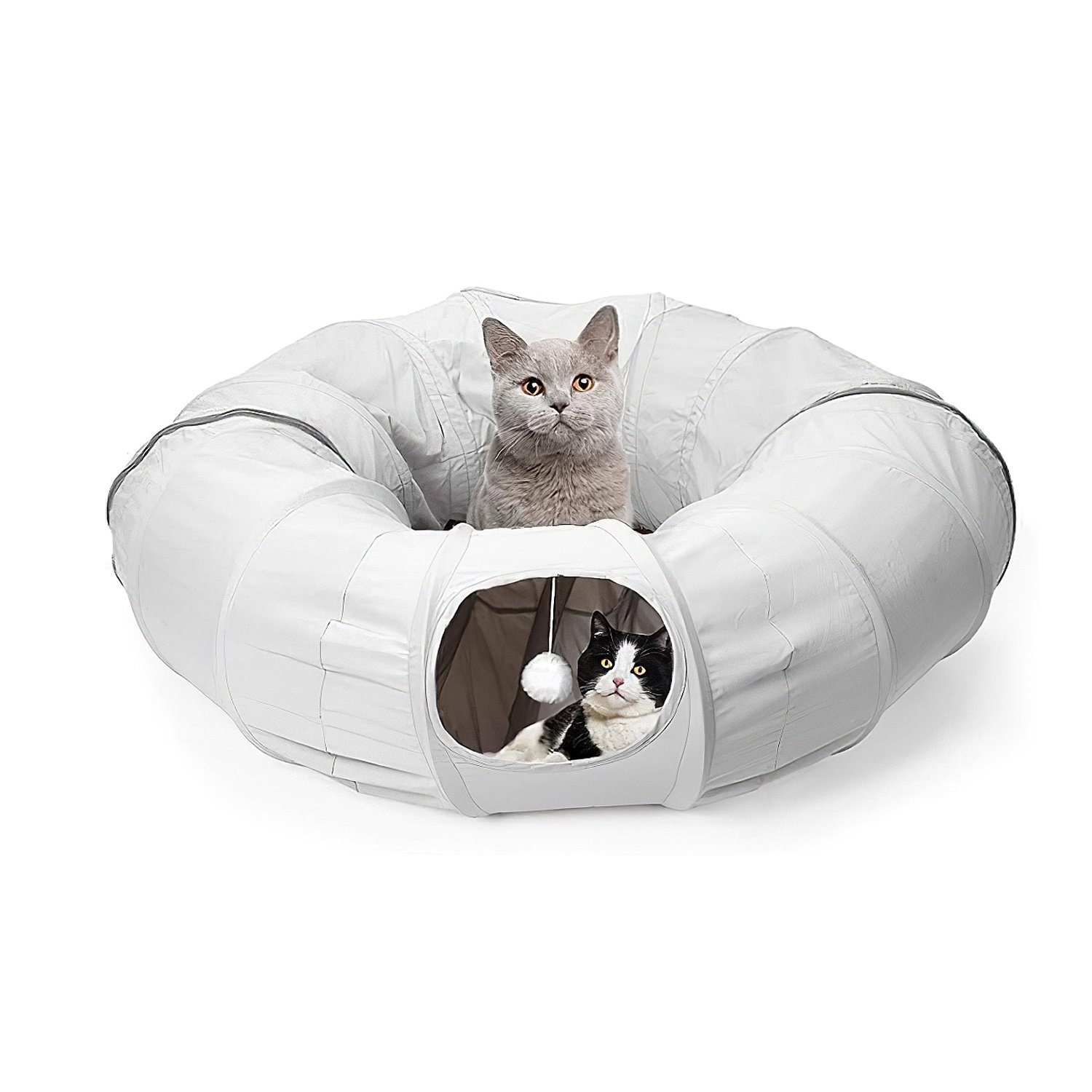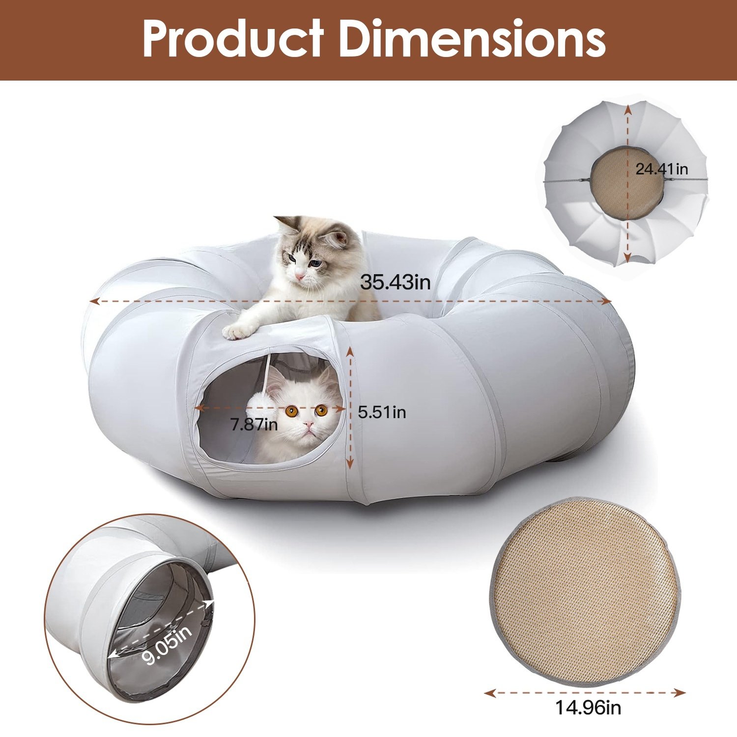 *2-IN-1 Cat Tunnel*:Consist of 2 semicircle cat tunnels and 1 round mat,this cat tunnel provides a funny playground for your furry friends to run,chase,hide-and-seek,meet the natural playing instinct. Soft,comfortable mat attract your cat to spend the whole day to lie and rest.