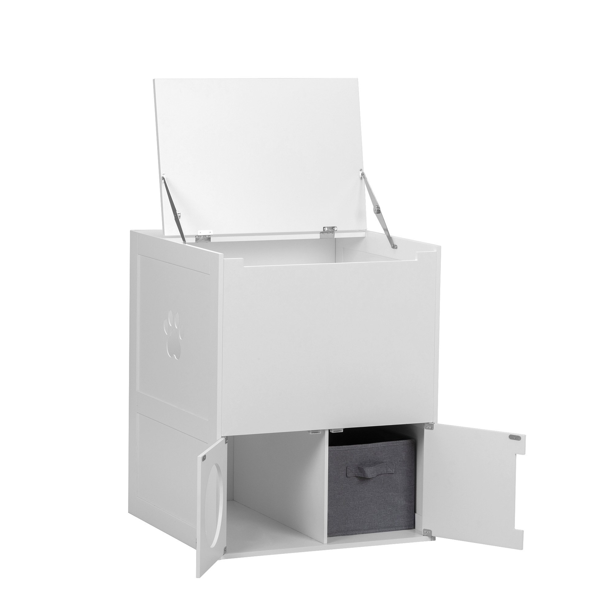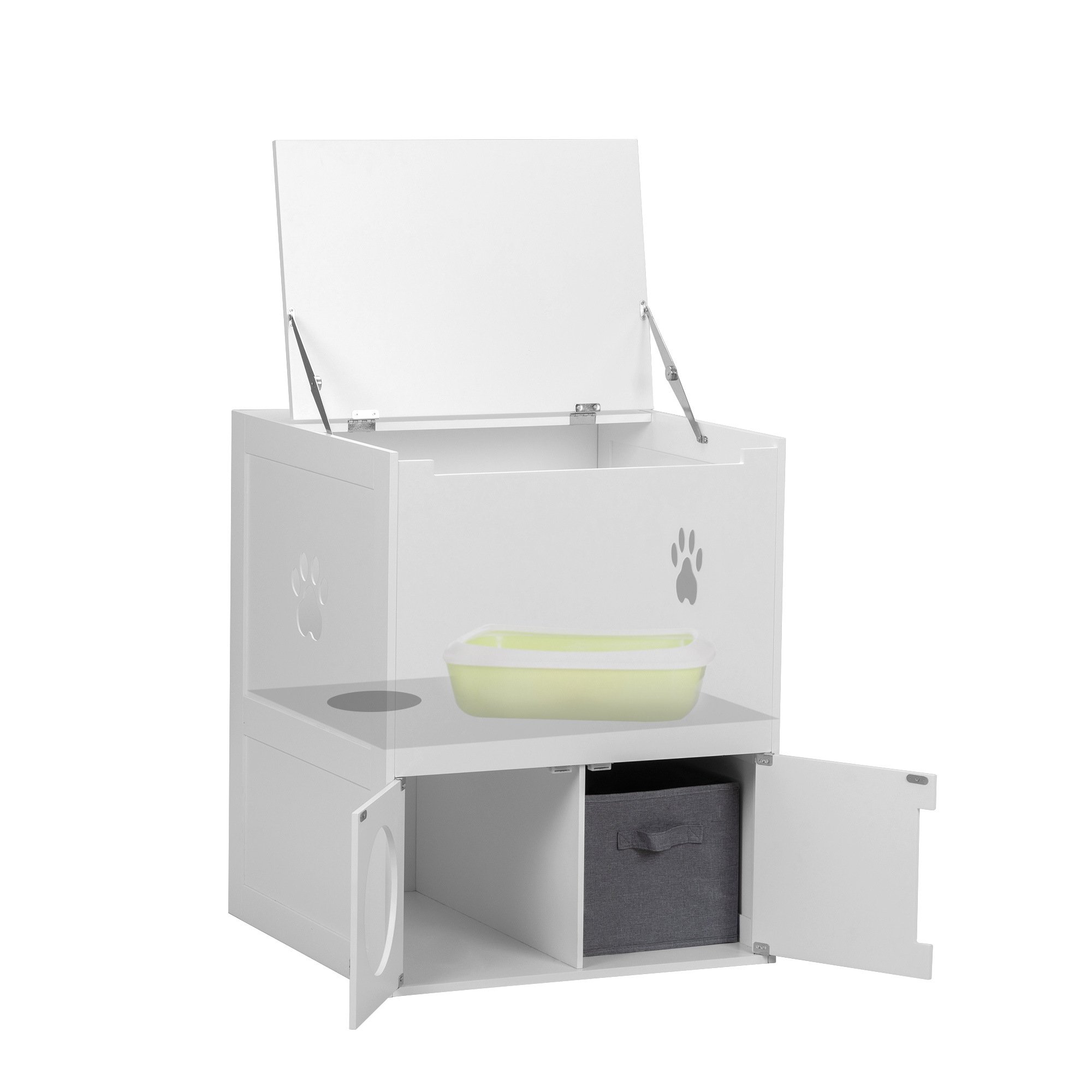 Large Wooden Cat Litter Box Enclosure With Jumping Platform and Fabric Drawer; Indoor Hidden Cat Washroom Furniture; White