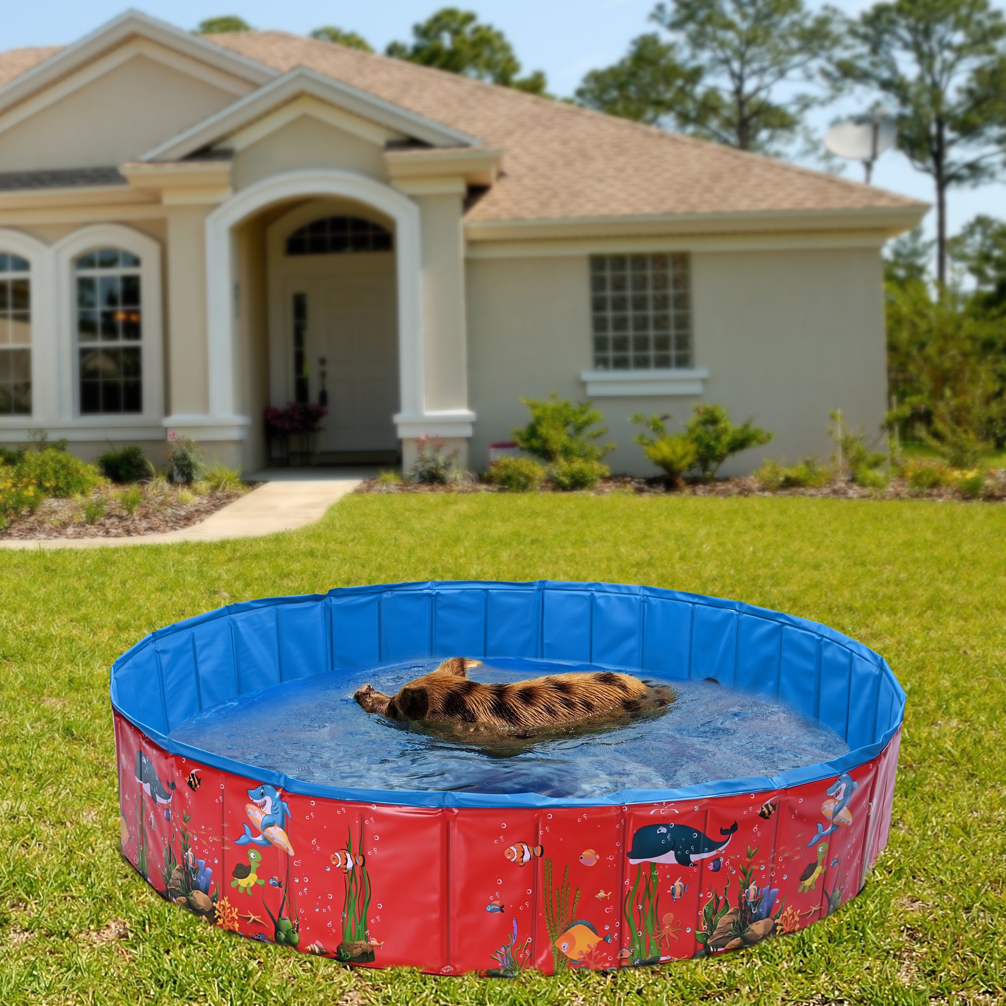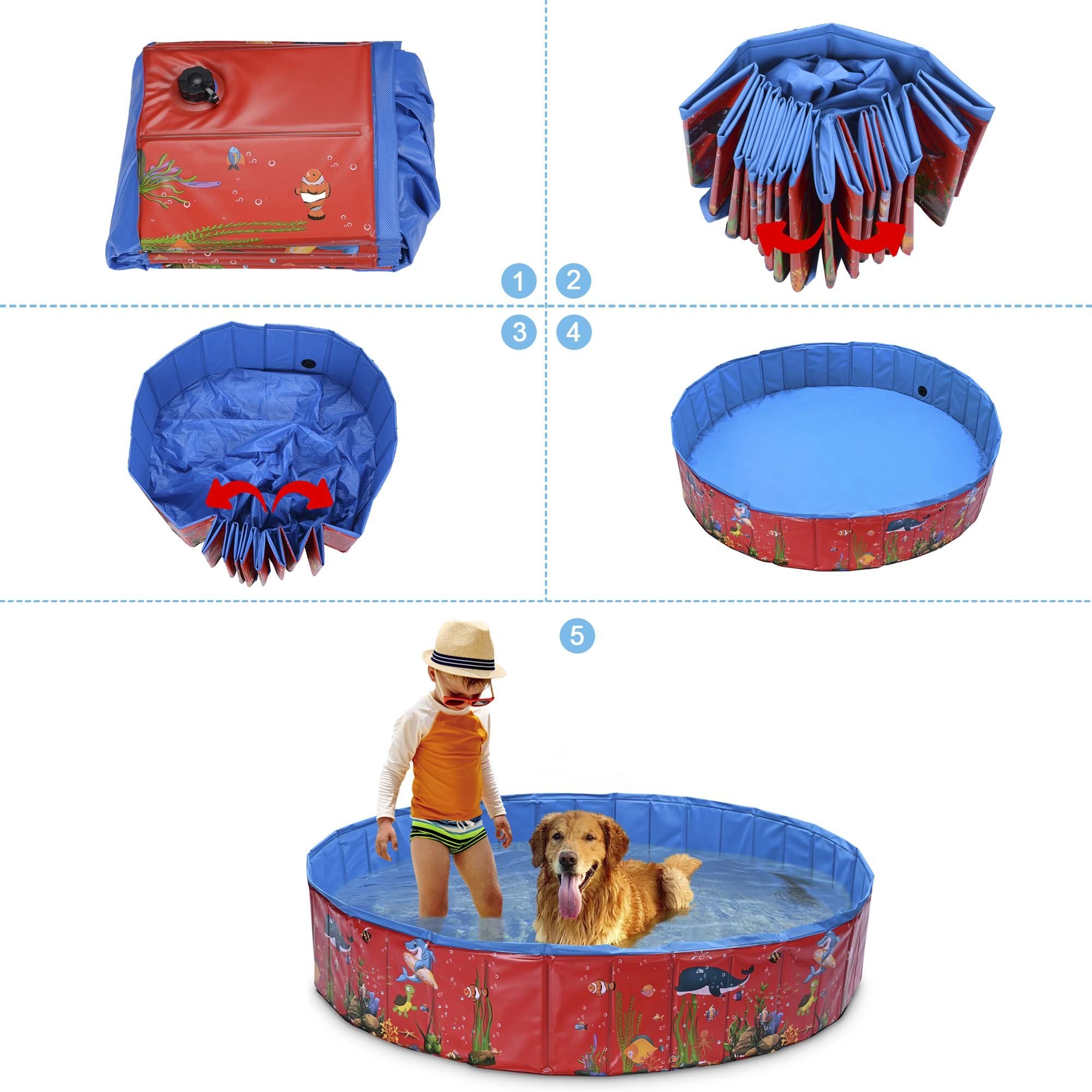 - Portable Pool - Pet Swimming Pool features folding structure for great portability, folding it into a compact size for space-saving storage or taking to everywhere, easily unfolding it at your home, backyard, garden and other outdoor places to offer a funny dabble time for your lovely pet or kids