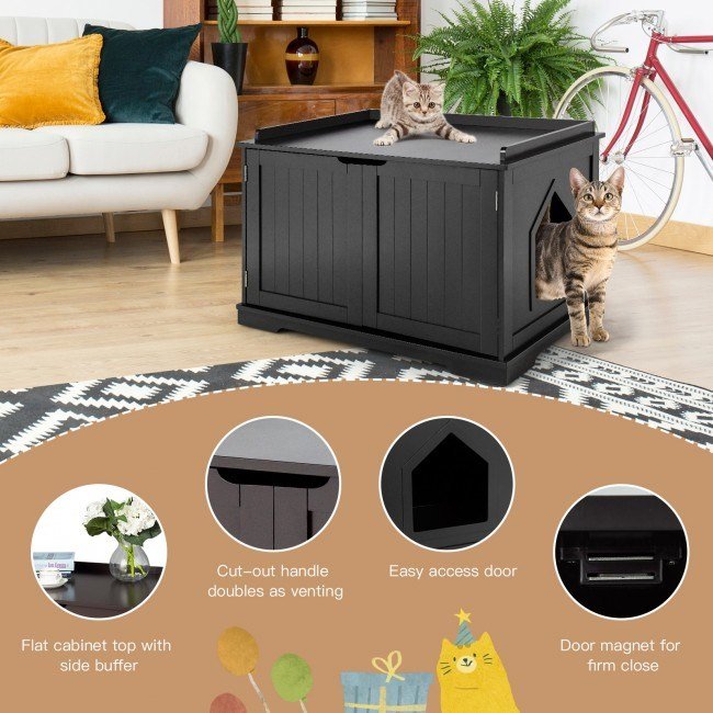 Multifunctional cat house meets your various needsExtra countertop space for cat's fun owing to the wide top with anti-falling apron rimMade of sturdy MDF with large bearing capacity; stable and durableSuitable for most litter boxes or pet bedsRemovable inner wall for separate storageLarge-sized cat hole for easy accessSide magnetic door with handles makes it easy to cleanTwo doors ensure good air circulation during the cleaning processSmooth surface without burrs; safe to touch and play withCreate a pet with a private and safe space to do their own businessEasy assembly within minutes with instruction included