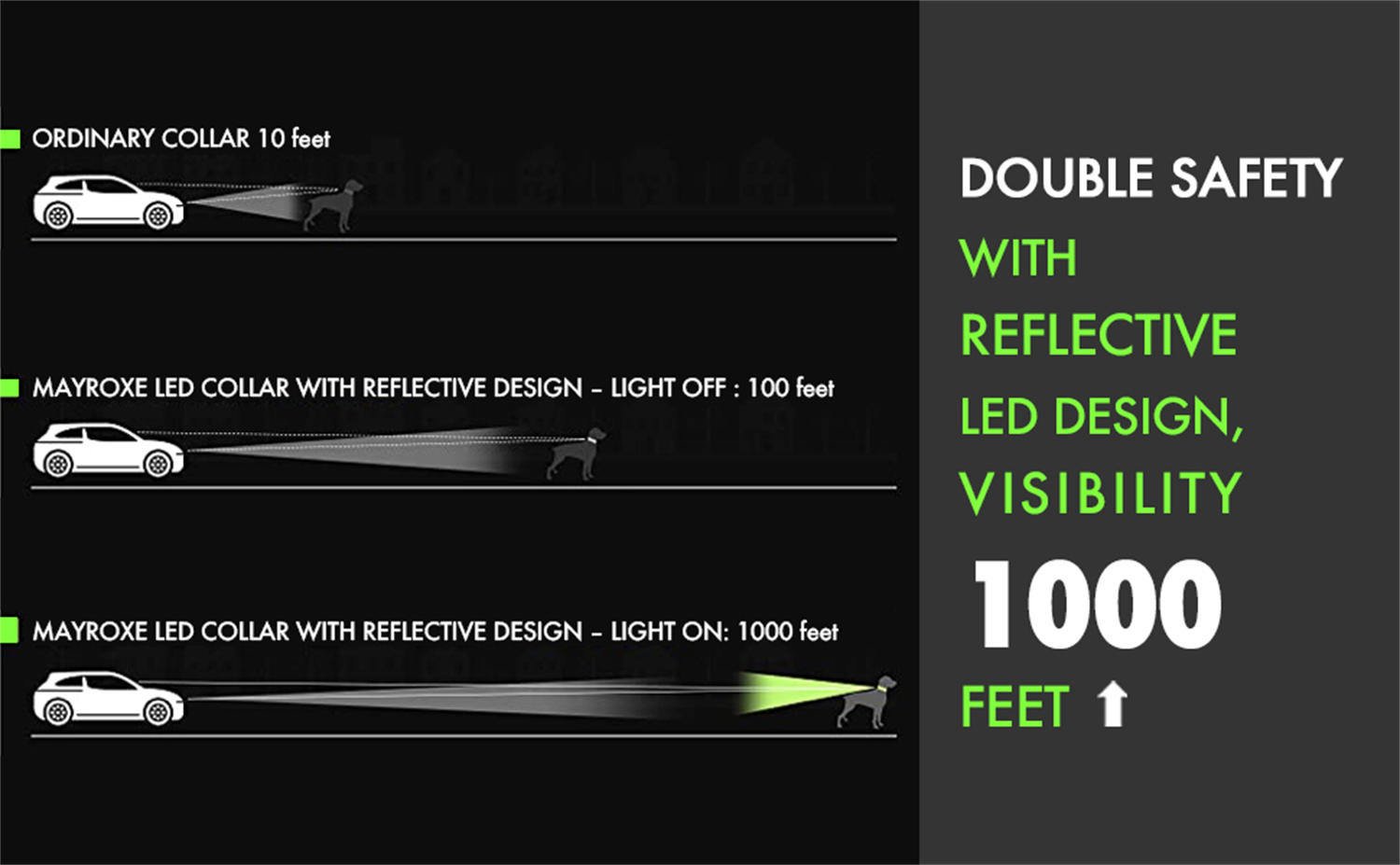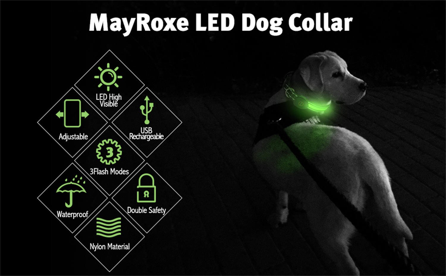 [High visibility and Safe]: MayRoxe dog collar light with excellent brightness can keep you dog be seen by vehicles in advance from 1002 FT; and outstanding illuminated led pass evenly through the collar; be seen from any angle.