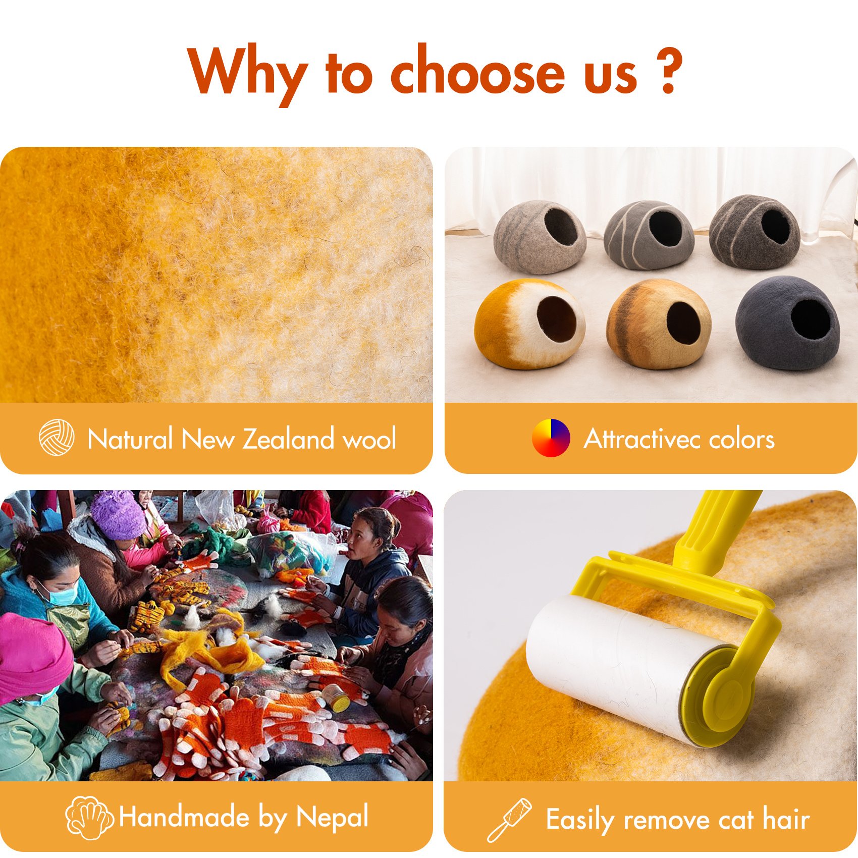 [Handcrafted Cat Cave]Each cat cave bed is handcrafted by crafters in Nepal.it is made of wool; its good for cold weather as this will keep them warm.the cave cat bed gives your pet a touch of privacy and creates a good sense of security; the ideal cat hideaway. the cave comes with a mouse toy as a gift.