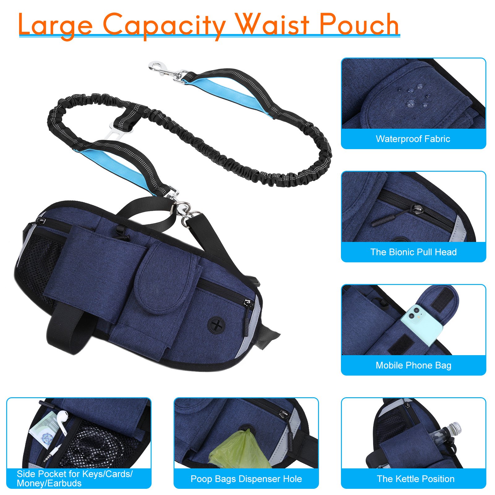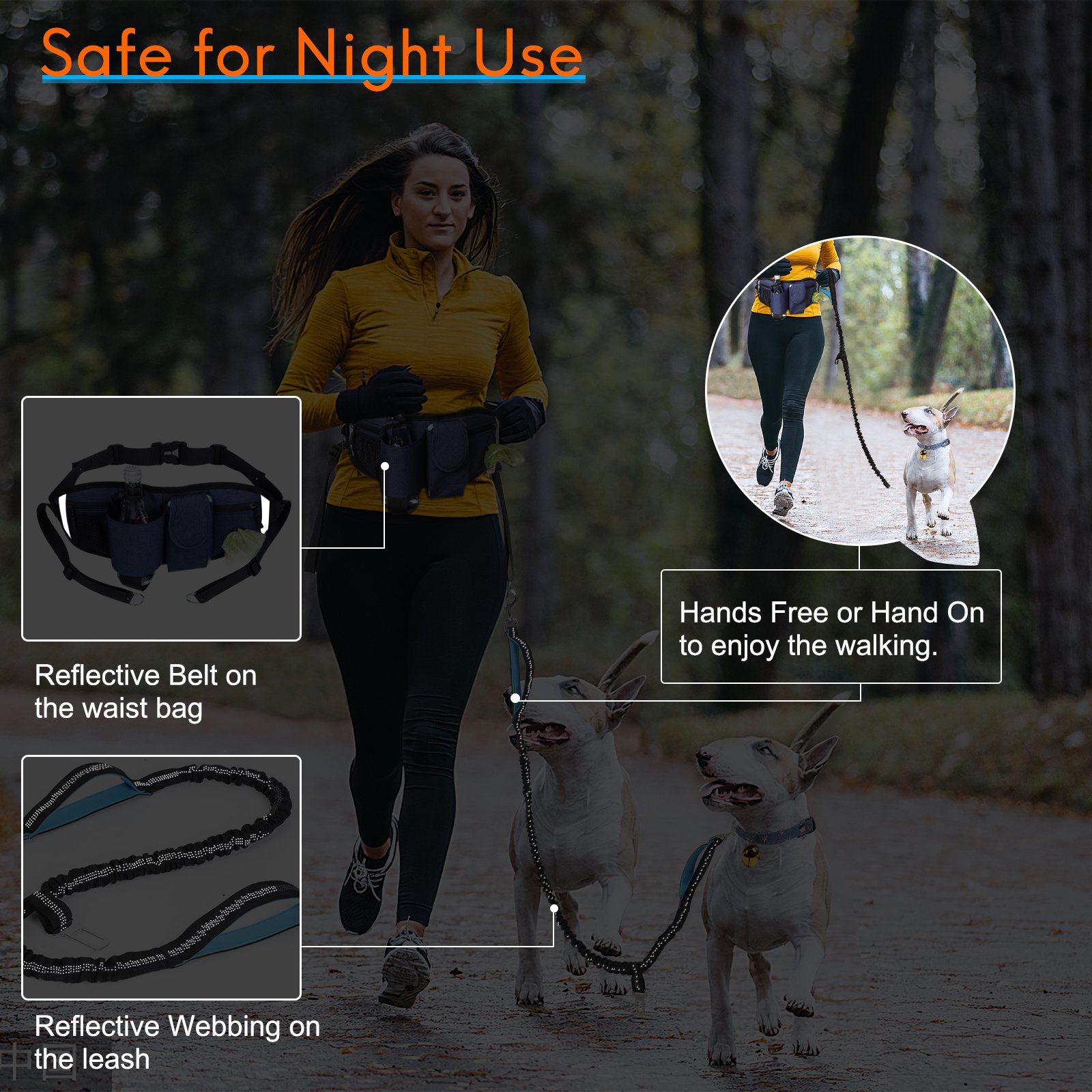Home > Hands Free Dog Leash with Waist Bag for Walking Small Medium Large Dogs; Reflective Bungee Leash with Car Seatbelt Buckle and Dual Padded Handles; A