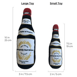 Bonne et Filou is now serving Red Whine All Day! Open a bottle of Bark'gundy Red Whine from our exclusive collection - the perfect toy for any occasion! The plush exterior is soft with an interior squeaker that will give your dog(s) hours of fun; while you can have your own glass of Burgundy (or Bordeaux; we don't judge) at home! Every Pampered Pup should have their own wine bottle; don't you think? Santé! Cheers!- Fun and Adorable Design: Your dog has its own version of a Burgundy wine bottle (only healthier) so you can share a drink with your furry friend! Perfect for fetching; snuggling or playing.- Ultra Soft Plush Material: Made from skin-friendly and incredibly soft; high-quality plush. Perfect for all breeds: small; medium and large dogs as well as for mild or aggressive chewers. (Always supervise your dog when playing.)- Tons of Fun: Contains a built-in squeaker that is protected by a layer of fabric to prevent it from ripping out. Creates endless hours of fun so your dog(s) never gets bored.- Unique and Fun Gift: This wine bottle plush toy is the perfect gift for any dog lover or dog birthday/puppy party.- Quick and Easy to Clean: This toy can be surface washed with cold water and air dried. However; please note that this plush toy is not indestructible.- Packaging is both in English and French.