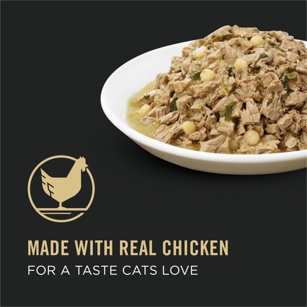 Purina Pro Plan Complete Essentials Wet Cat Food Chicken Pasta Spinach, Combine enticing flavors and nutritional support in Purina Pro Plan COMPLETE ESSENTIALS Chicken, Pasta and Spinach Entree in Gravy adult wet cat food. We carefully select every high-quality ingredient for a specific purpose. The high protein canned cat food uses real chicken complemented with pasta and spinach and features an optimal protein level to help her maintain an ideal body condition. Antioxidants help support her healthy immune system, and omega-6 fatty acids and vitamin A nourish her skin and coat.