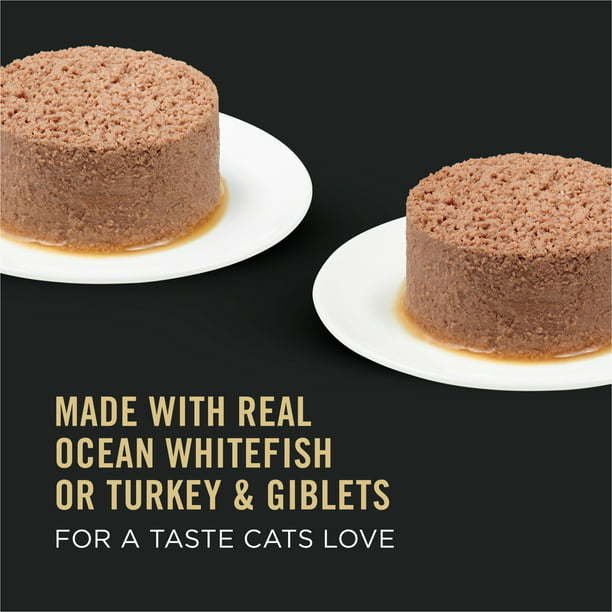 Pate cat food made with real turkey and giblets or ocean whitefish for a taste cats love in highly digestible formulas for optimal nutrient delivery